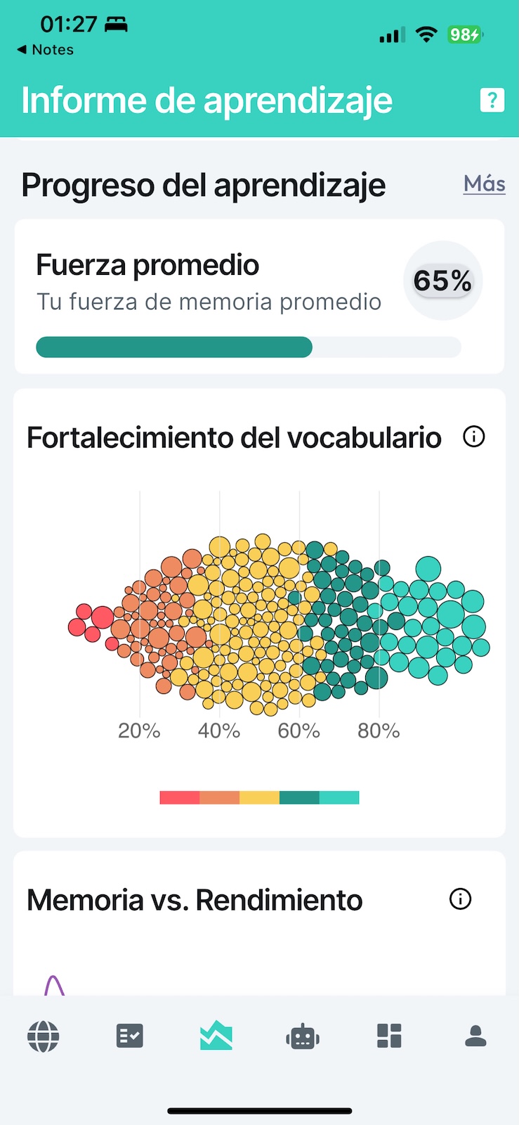 See a clear breakdown of your language skills across eight main word types (Nouns, Verbs, Expressions, etc.) with easy-to-read mastery indicators. Discover your natural strengths and weaker areas so you can focus your study and use your best categories to boost overall fluency.