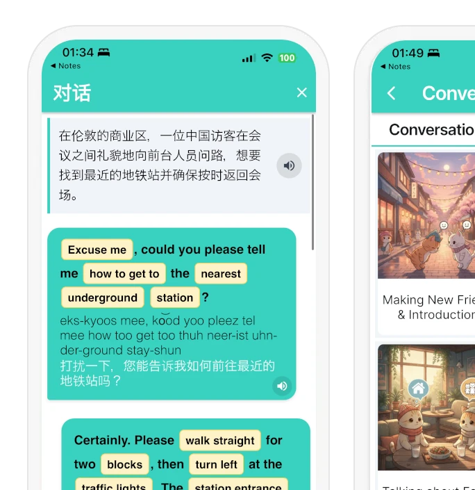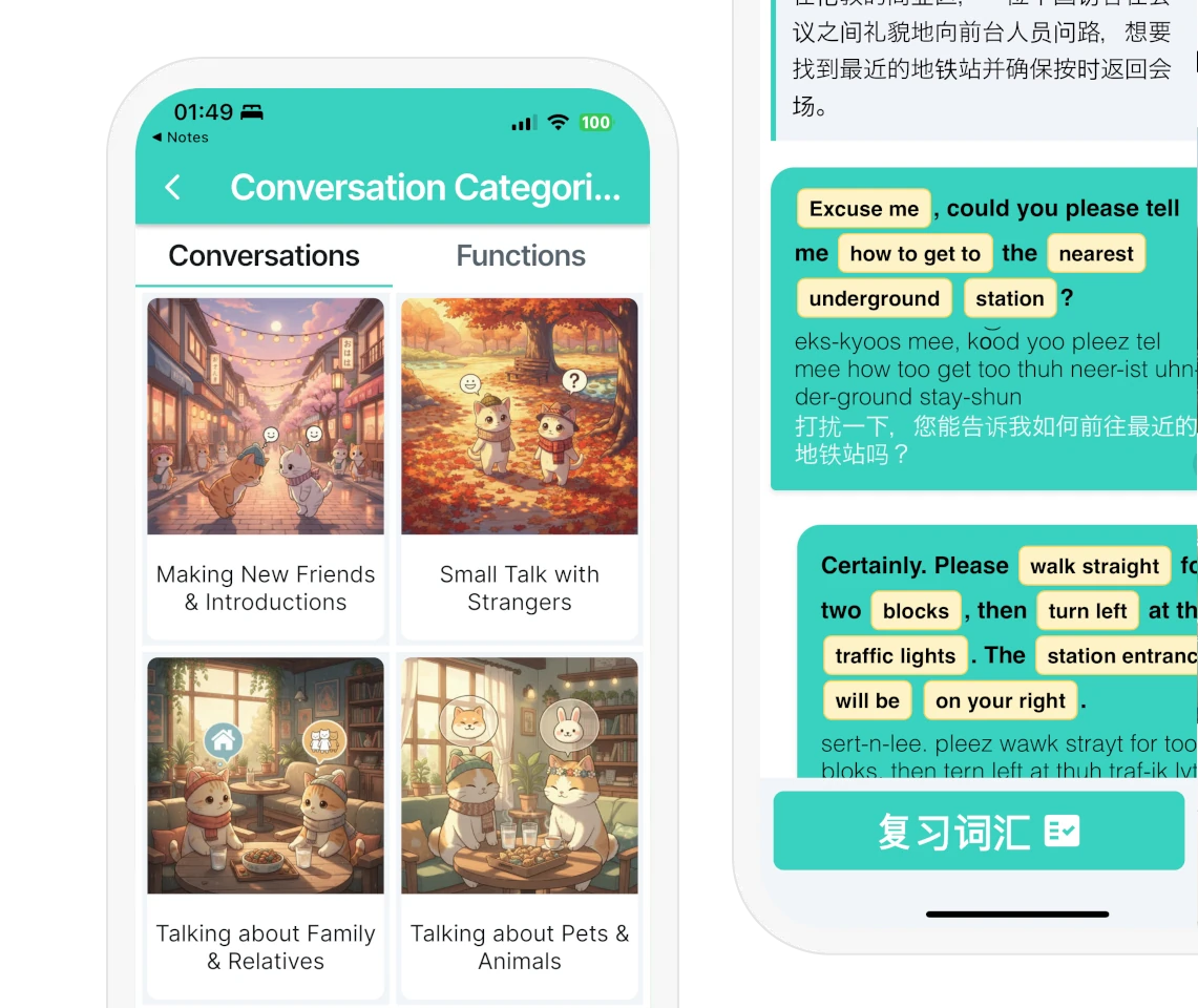 Every conversation includes audio at two speeds—Normal and Slow (70%)—to fine-tune your listening skills. Practise each vocabulary word with unlimited, crystal-clear recordings from native speakers, helping you train your ears before you speak.