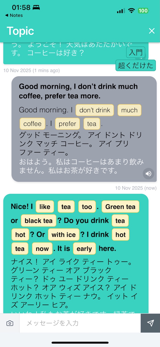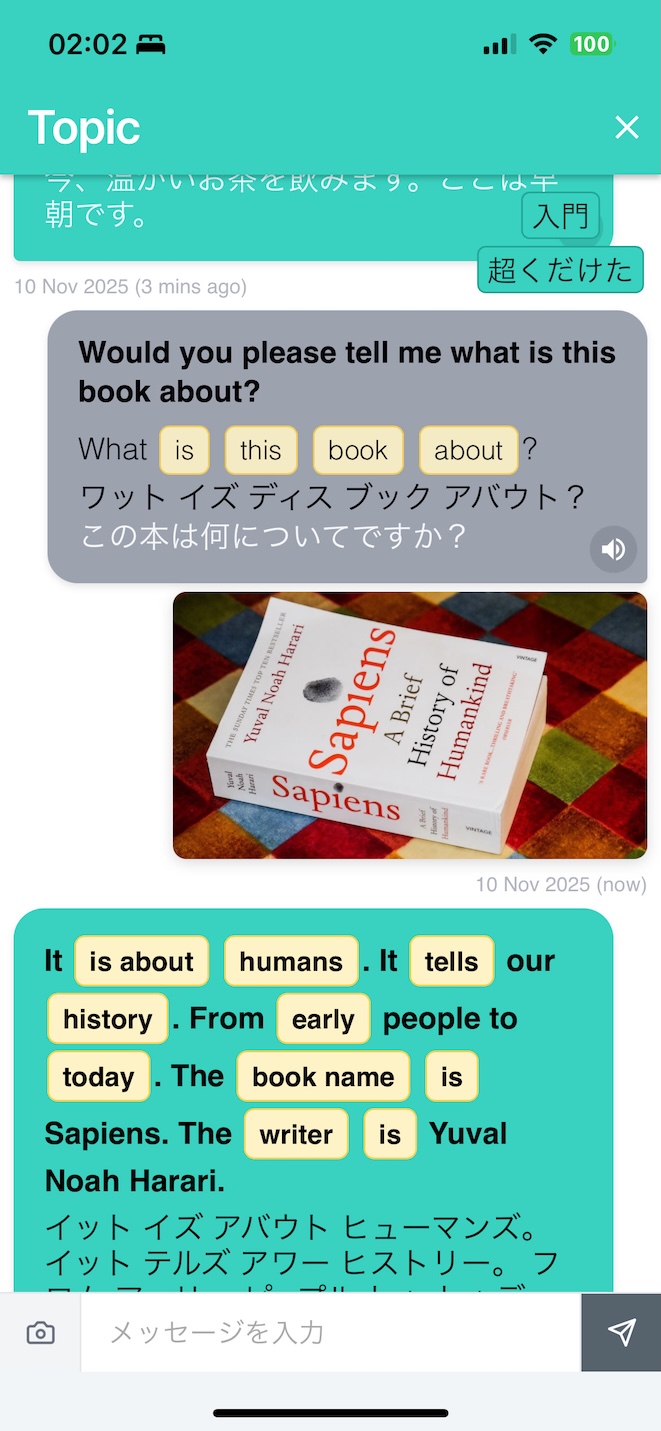 AI explains how and when to use each word, highlights levels of formality, and cultural nuances, while suggesting 3–4 different conversation paths. Pick topics that interest you, creating a continuous learning journey rather than isolated lessons.